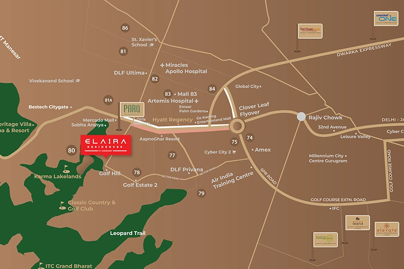 Conscient Elaira Residences Sector 80 Gurgaon is strategically located near NH-8, SPR, and Dwarka Expressway, offering quick access to major corporate hubs, schools, hospitals, and entertainment zones for convenient family living.